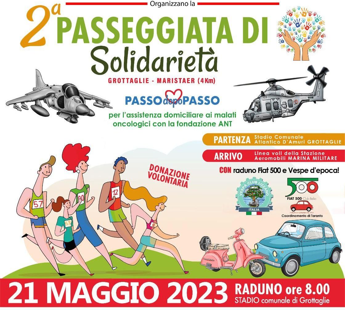 L’A.S.D. Atletica Grottaglie, la Stazione Aeromobili MM (MARISTAER) di Grottaglie e UISP Taranto APS, in collaborazione con la Fondazione ANT e Tutto sport Taranto, organizzano la 2^ edizione della Passeggiata di Solidarietà.