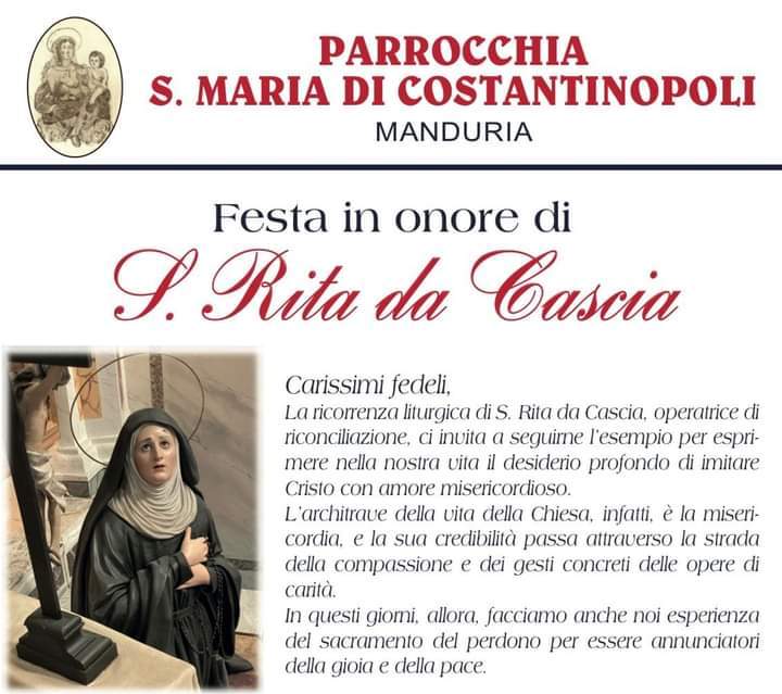 Ore 18,30: Santo Rosario con litanie cantate a Santa Rita e S. Messa presieduta da padre Maurizio Cino, superiore della comunità dei Passionisti di Manduria.
