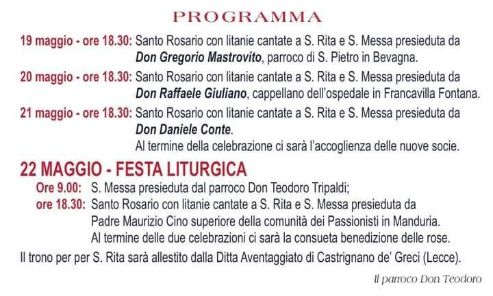 Sabato 20 maggio – Ore 18,30, Santo Rosario con litanie cantate a Santa Rita e S. Messa presieduta da don Raffaele Giuliano, cappellano dell’ospedale di Francavilla Fontana.