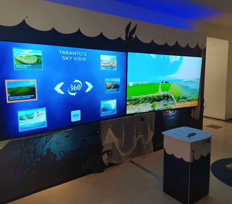 Il visitatore è accolto da una grande postazione attraverso la quale è possibile esplorare virtualmente, tramite video- riprese a 360° sub-acque e da drone, le meraviglie dei fondali marini che il territorio costiero e lagunare di Taranto offre. Tali tecnologie, grazie alla forte componente interattiva ed immersiva, assolvono alla funzione di valorizzazione del territorio, di attività formativa e didattica. A tal fine l’impianto è predisposto anche per una esperienza multisensoriale.