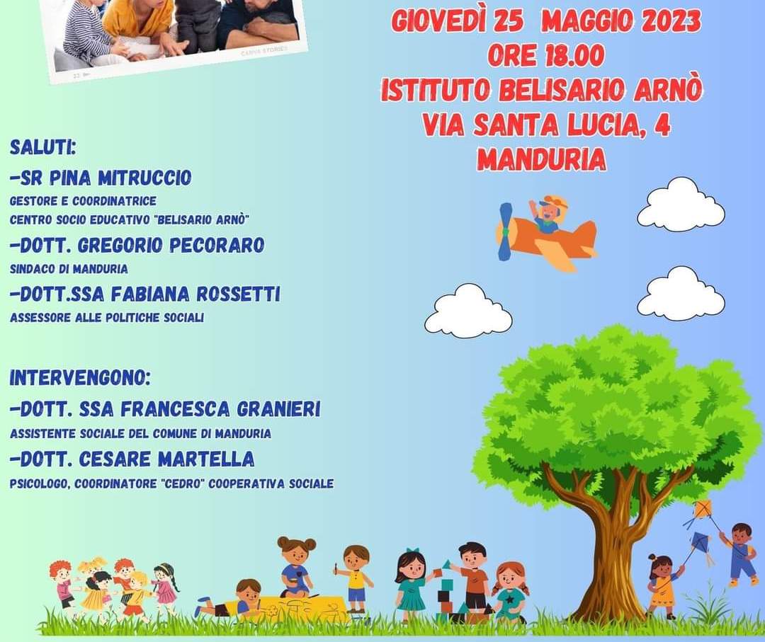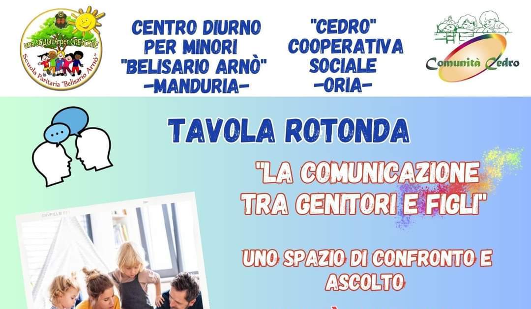 Il centro socio educativo per minori “Belisario Arnò” di Manduria propone per giovedì 25 maggio, alle ore 18, presso il proprio istituto sito in via Santa Lucia 4, una tavola rotonda dal titolo “La comunicazione tra genitori e figli…uno spazio