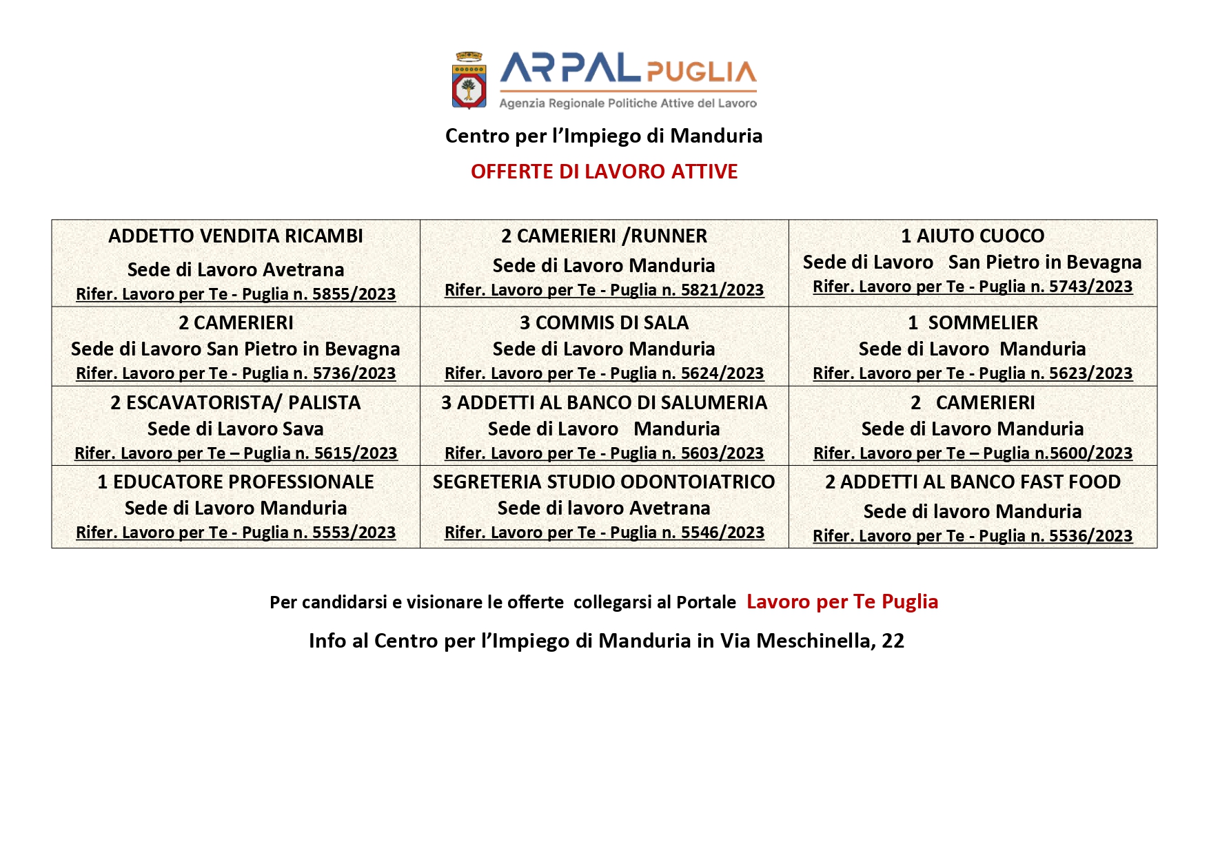 Nuova disponibilità di posti di lavoro attraverso il Centro per l’Impiego di Manduria. Nello schema che segue, l’indicazione delle figure richieste e i luogo di lavoro.