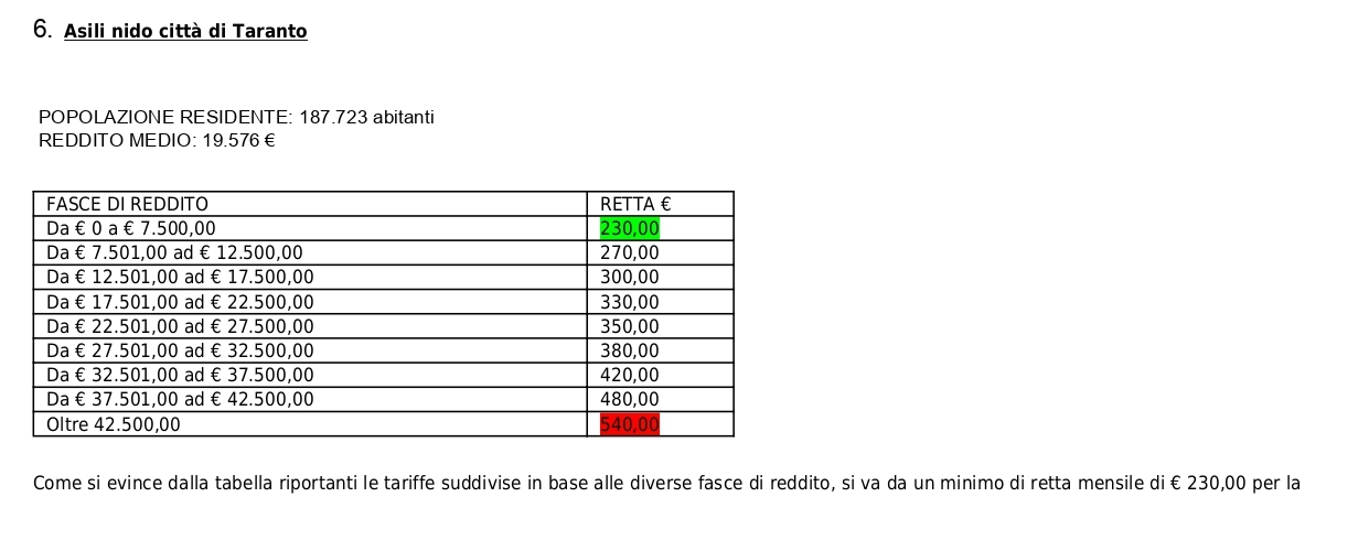 I residenti tarantini che producono una fascia di reddito oltre i 42.500 euro usufruiscono dei servizi al costo di 540 euro mensili. Ancora, il servizio offerto dal Comune di Taranto è il più esoso in relazione al reddito medio, perché la retta ammonta a 330 euro. Il reddito medio della città ionica è di 19.576 euro e il numero degli abitanti è pari a 187.723. Infatti, in altre città la cui retta mensile corrisponde a quella fascia di reddito è circa la metà. Il confronto, per esempio, è evidente con Brindisi, ultima in classifica, il cui reddito medio è di 19.015 euro con i cittadini usufruiscono del servizio pagando 253 euro mensili.