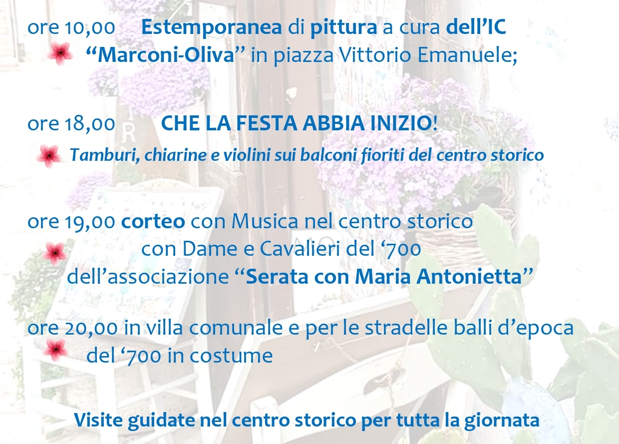 Per sabato 10 giugno l’evento inaugurale vedrà la partecipazione straordinaria dell’associazione di Fasano “Serata con Maria Antonietta”, che ci farà sognare con i propri soci che sfileranno e balleranno con gli abiti di epoca settecentesca per le vie del centro storico. Inoltre, giovedì 1 giugno 2023 gli studenti dell’IC “Marconi-Oliva” hanno partecipato all’estemporanea di pittura con tema “balconi fioriti”. Le loro opere saranno esposte sabato 10 giugno in piazza Vittorio Emanuele.