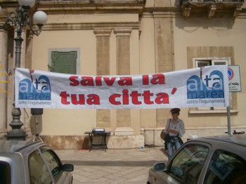 L’avvocato Antonio Lupo chiarisce alcuni aspetti della diffida presentata alla Regione Puglia: «Il valore obiettivo di 1 nanogrammo a metro cubo per la presenza nell’aria di benzo(a)pirene, è stabilito dal decreto legislativo 152/2007. Nel 1999 era già previsto invece l’obiettivo di qualità, sempre pari a 1 ng/m³. La Regione deve intervenire di fronte a un superamento dei limiti, attraverso piani di risanamento della qualità dell’aria, e un piano d’azione che preveda l’abbassamento delle emissioni. Il Sindaco, così come la Provincia, deve sottoscrivere questa diffida qualora non ci fossero i presupposti per un miglioramento della situazione».Qualche minuto più tardi, il sindaco Stefàno si presenta tra i manifestanti. Gli impegni lo trattengono dal discutere le proposte di Altamarea lì tra la gente, qualcuno lo contesta, qualcuno “vestito da indiano” gli regala un lupino, tipico prodotto delle nostre tavole dopo il pranzo della domenica. Il sindaco se la cava con una battuta, ma è ormai chiaro che non scenderà più a parlare come aveva annunciato precedentemente.