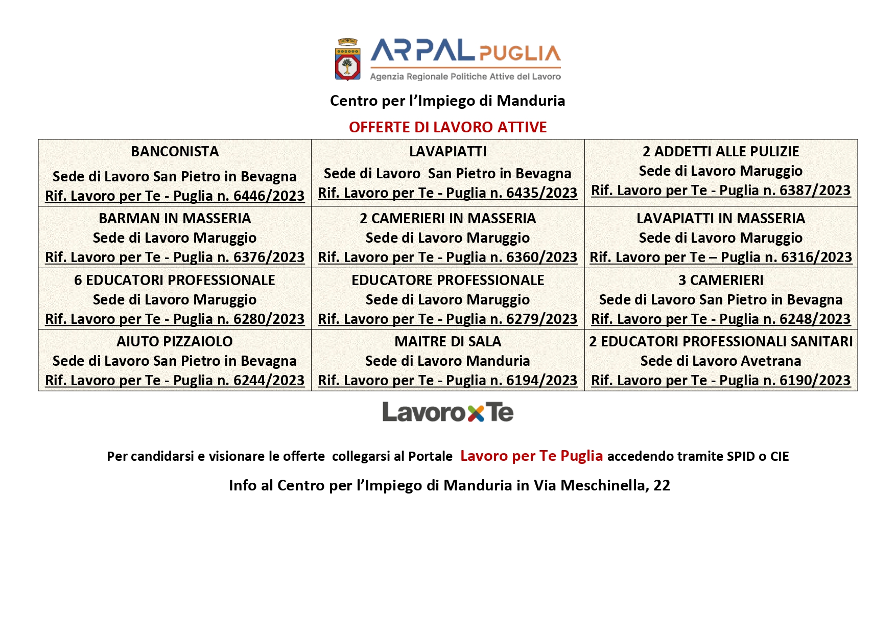 Segue il prospetto degli annunci del Centro per l’Impiego di Manduria.