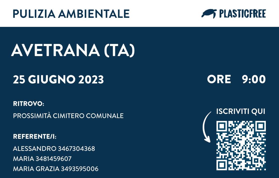 Chiunque sia interessato a partecipare dovrà iscriversi all'evento sfruttando il Qrcode della locandina oppure cliccando al seguente link: https://www.plasticfreeonlus.it/eventi/4781/25-giu-avetrana