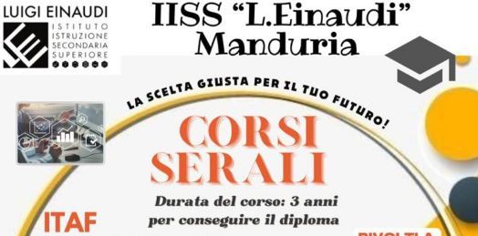 L’ I.I.S.S. “L. Einaudi” di Manduria propone per l’anno scolastico 2023-2024 due corsi di istruzione serale per adulti: Amministrazione Finanza e Marketing e Servizi per l’Agricoltura e lo Sviluppo Rurale.