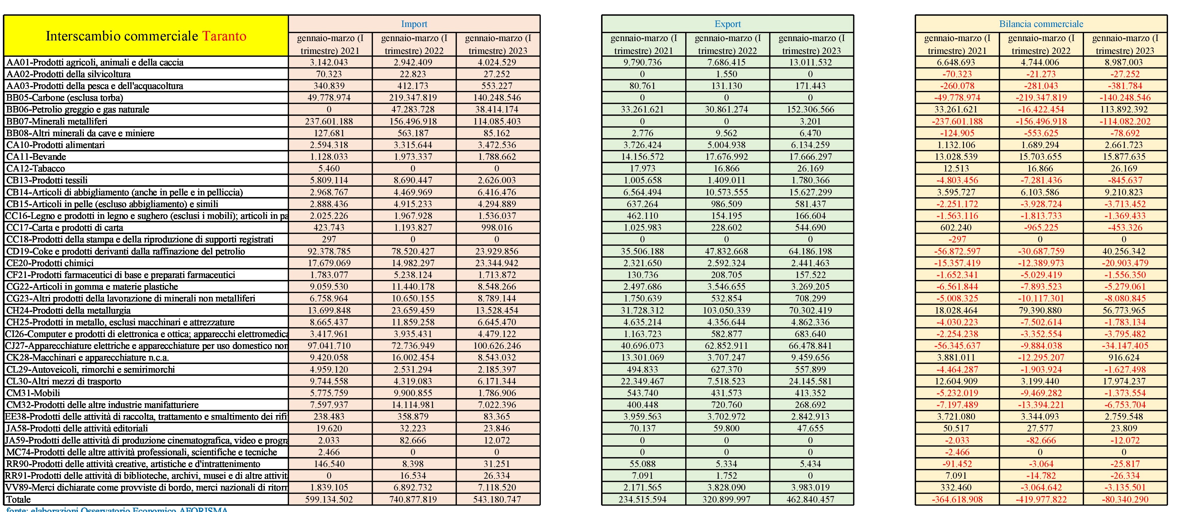 Le aziende della provincia di Taranto hanno esportato beni per un valore di 463 milioni di euro ma ne hanno importati per 543 milioni di euro, determinando un saldo negativo di 80.340.290