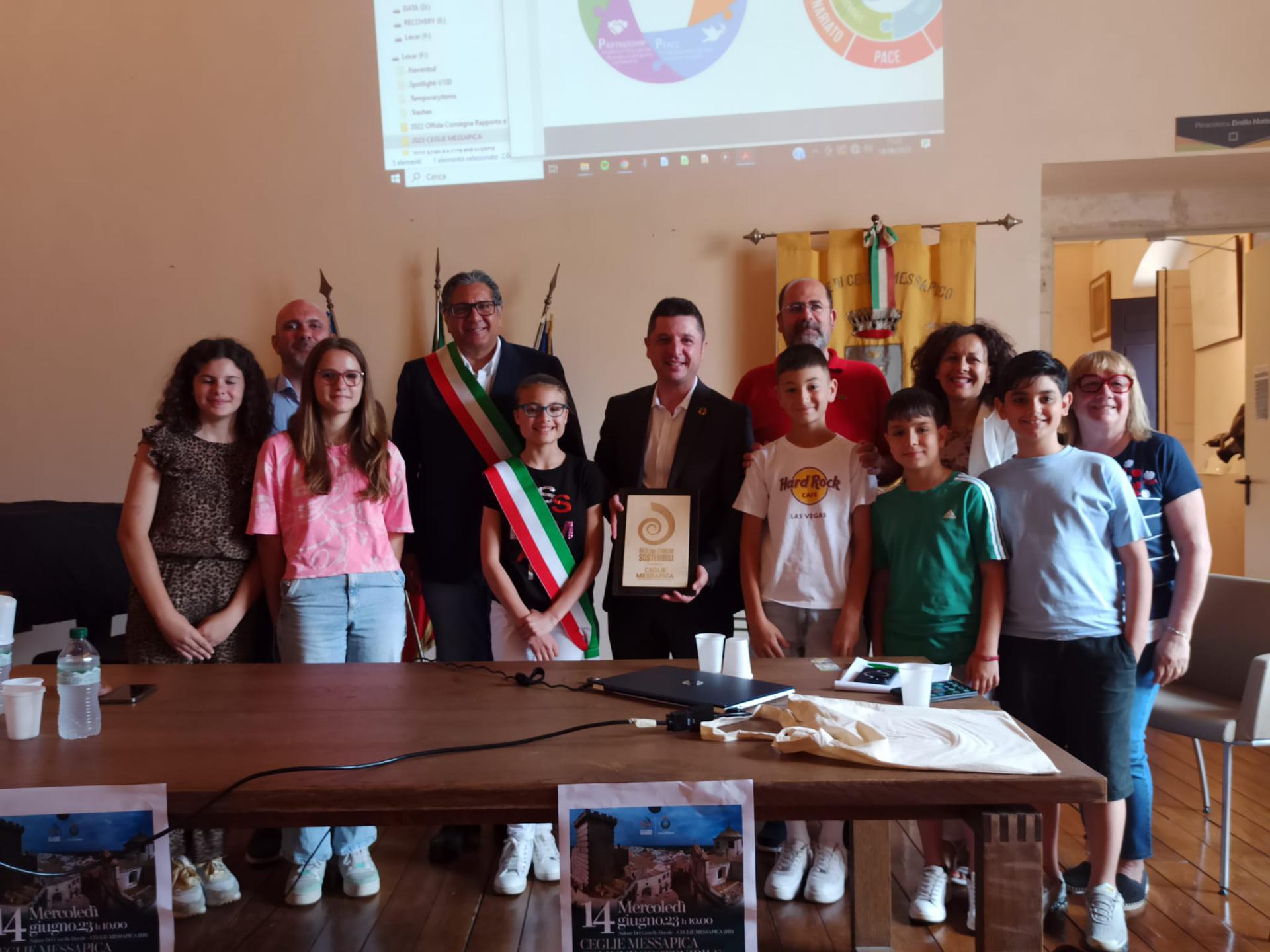 Il Comune di Ceglie Messapica entra a far parte della Rete dei Comuni Sostenibili. Si tratta del secondo comune della provincia di Brindisi a entrare nell’associazione, che ne conta in totale 12 in Puglia. La targa, un oggetto d’artigianato unico ed ecocompatibile, è stata consegnata nel Salone del Castello Ducale mercoledì 14 giugno da Giovanni Gostoli e Maurizio Gazzarri, rispettivamente direttore e responsabile analisi e sviluppo del monitoraggio della Rete dei Comuni Sostenibili, all’Amministrazione comunale, rappresentata dal sindaco Angelo Palmisano e dall’assessore all’ambiente Antonello Laveneziana. Sono intervenuti anche Gianmichele Pavone (avvocato del Foro di Brindisi e giornalista) e Maria Carla Maggiore, professoressa dell’istituto comprensivo di Ceglie Messapica, che ha moderato l’evento. All’iniziativa sono intervenuti anche i giovani del Consiglio comunale dei ragazzi.