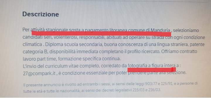 Si legge nell'inserzione dell'azienda appaltatrice del Comune di Manduria per la gestione dei parcheggi nelle marine, che condizione necessaria è l’invio di una foto “a figura intera” del candidato. Ora, a parte la scontata battuta che potrebbe scaturire, chiedendoci se si tratta delle selezioni per ausiliari del traffico o per l'invenzione geniale di quest’anno di Miss S. Pietro in Bevagna, c'è davvero da chiedersi con che criterio si selezionino le aziende collaboratrici da parte di questa Amministrazione da barzelletta.