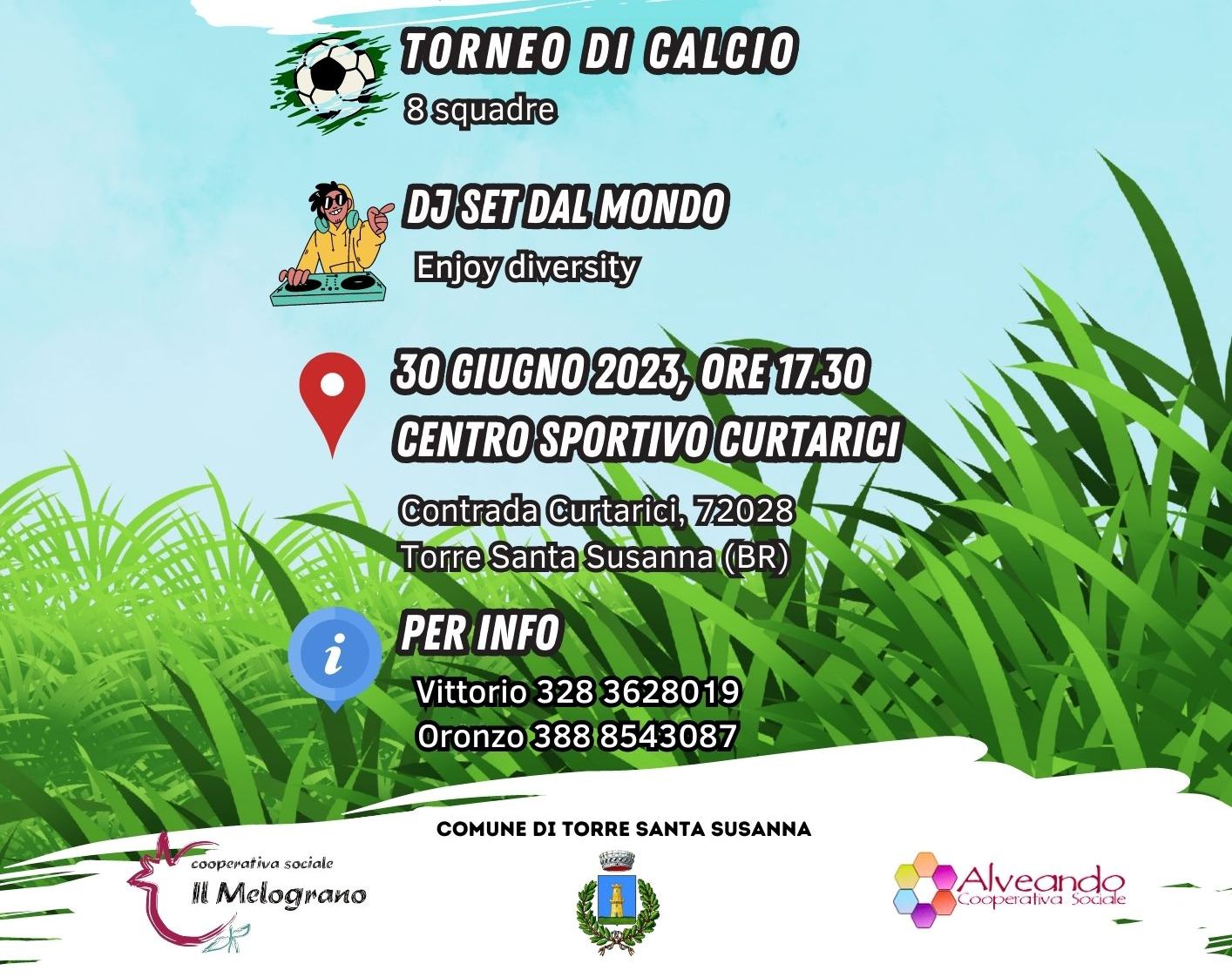 Venerdì 30 giugno a Torre Santa Susanna, la cooperativa “Alveando” e la cooperativa "Il Melograno", enti gestori dei progetti SAI MSNA e Ordinari di Torre S. Susanna, organizzano un torneo di calcio presso il centro sportivo "Curtarici" a partire dalle ore 17.30.
