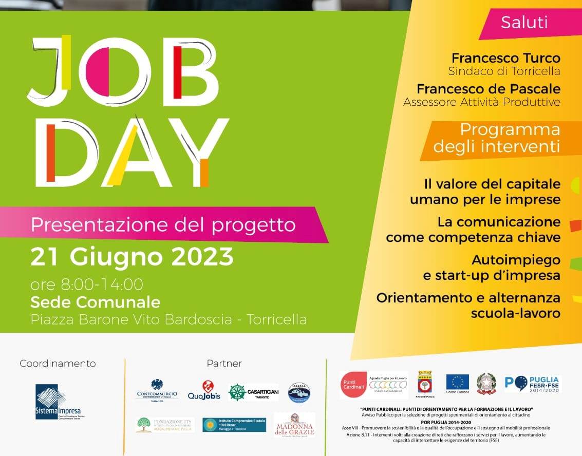 Primo Job Day di presentazione del progetto “Torricella Lavoro e Impresa”, rientrante nell’Avviso pubblico regionale ‘Punti Cardinali - Punti di orientamento per la formazione e il lavoro’ POR Puglia 2014/20, e del quale Sistema Impresa, il centro di assistenza tecnica di Confcommercio Taranto è assegnataria del Progetto .