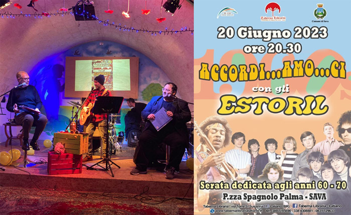 Forte dell’apprezzamento da parte del pubblico e delle istituzioni, della funzione di iniziativa fresca ed esclusiva dalla rassegna itinerante Taberna Book Festival e di ben tre repliche all’attivo, “Accordi…amo..ci con gli Estoril”, evento esclusivo della Taberna Libraria di Latiano, rientrante nella più ampia kermesse “Cultura, Spettacolo e...” firmata in collaborazione con De Vivo Home Design, SummerTime – Animazione & Spettacolo e Cantine San Donaci, travalica persino il territorio provinciale di Brindisi per debuttare oltreconfine nella provincia di Taranto con la sua quarta tappa e per la prima volta in una piazza ed in prima serata.