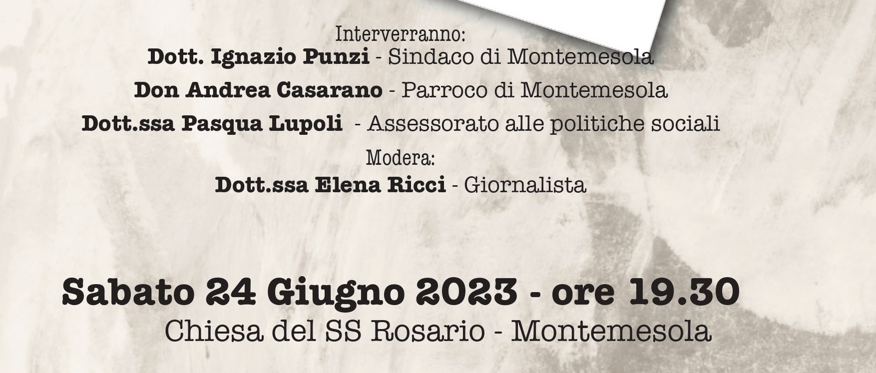 All'evento, patrocinato dall'Amministrazione comunale, interverranno il sindaco di Montemesola Ignazio Punzi, il parroco di Montemesola don Andrea Casarano e l'assessore alle Politiche Sociali Pasqua Lupoli.
