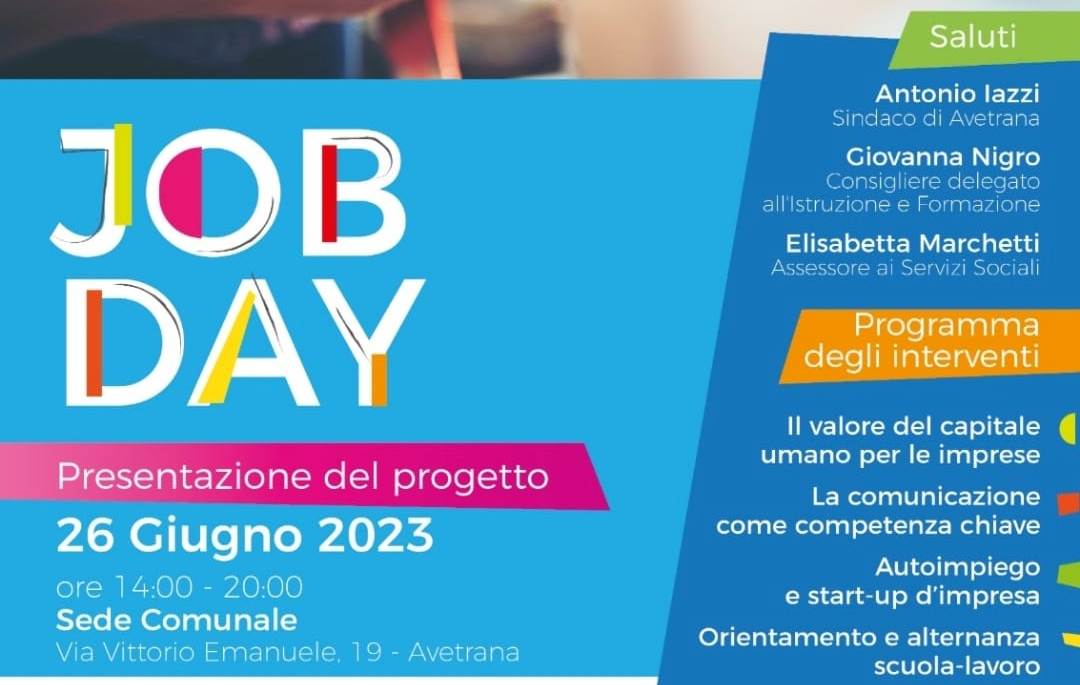 L’evento di presentazione si terrà lunedì 26 giugno - dalle 14 alle 20 - nella sede del Comune. Ad aprire i lavori del Job Day sarà il sindaco Antonio Iazzi; interverranno l’assessore alle Politiche Sociali Elisabetta Marchetti e la consigliera delegata alla Istruzione e alla Formazione Giovanna Nigro.