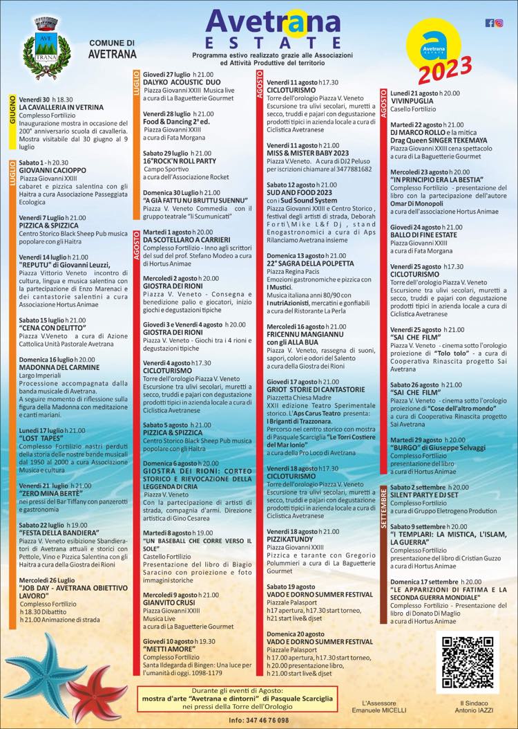 Il sindaco Antonio Iazzi e l’assessore allo Spettacolo Emanuele Micelli, presenteranno insieme alle associazioni e commercianti del territorio, le iniziative culturali e i vari spettacoli che allieteranno i turisti e cittadini avetranesi durante il periodo estivo.