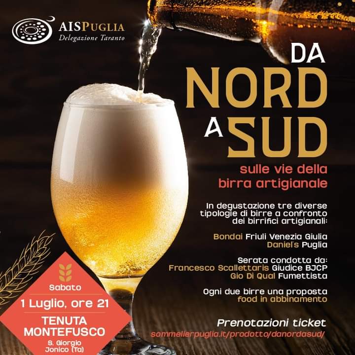 Sabato 1 luglio, alle ore 21, la delegazione AIS Taranto organizza l’evento “Da nord a sud: sulle vie della birra artigianale” presso la Tenuta Montefusco di San Giorgio Jonico.
