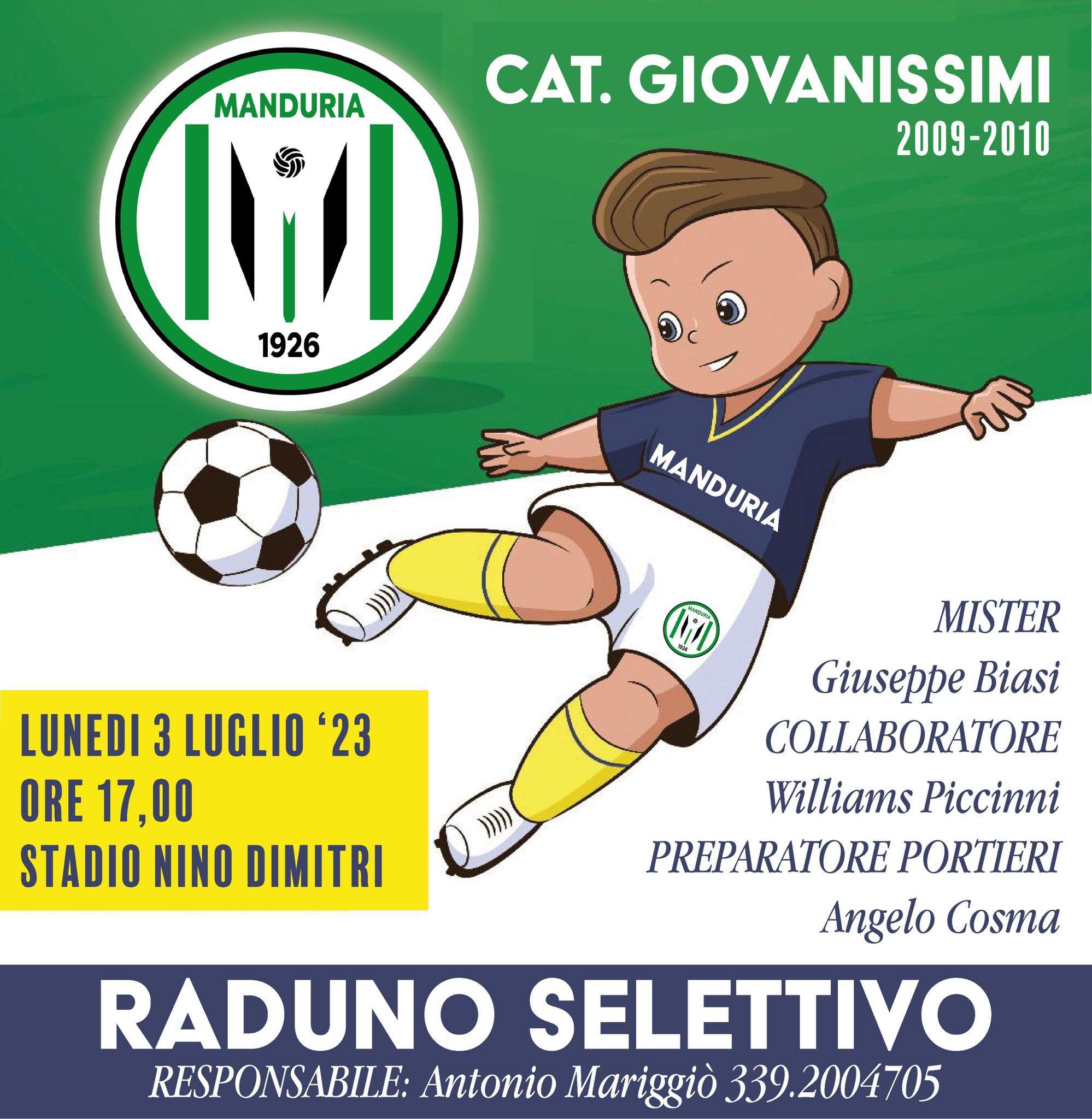 Due raduni selettivi per il Manduria. Sono stati fissati per il 3 luglio e per il 5 luglio e sono riservati, rispettivamente, ai Giovanissimi (2009-10) e agli Allievi (2007-08).