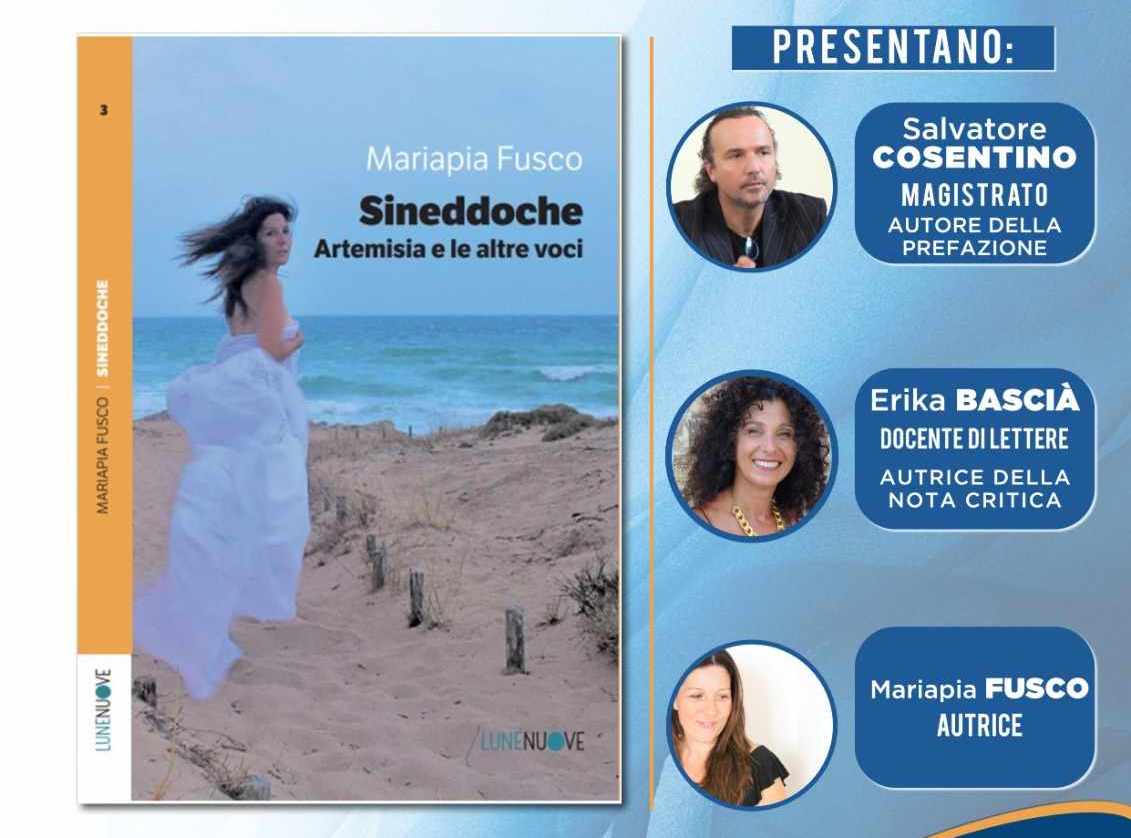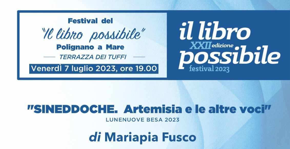 La nostra amica maruggese Mariapia Fusco presenterà il suo nuovo romanzo, "Sineddoche. Artemisia e le altre voci". Sarà presentato, in anteprima, alla XXII edizione del festival del “Libro Possibile” di Polignano a Mare. Ospiti della serata il magistrato Salvatore Cosentino che curerà la prefazione del romanzo e la critica Erika Basciá.