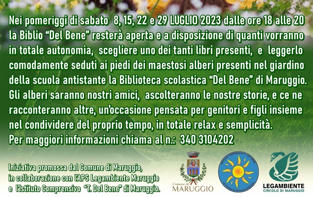 Nei pomeriggi di sabato 8, 15, 22 e 29 luglio, dalle ore 18 alle 20, la biblio “Del Bene” resterà aperta e a disposizione di quanti vorranno in totale autonomia, scegliere uno dei tanti libri presenti, e leggerlo comodamente seduti ai piedi dei maestosi alberi presenti nel giardino della scuola antistante la biblioteca scolastica “Del Bene” di Maruggio.