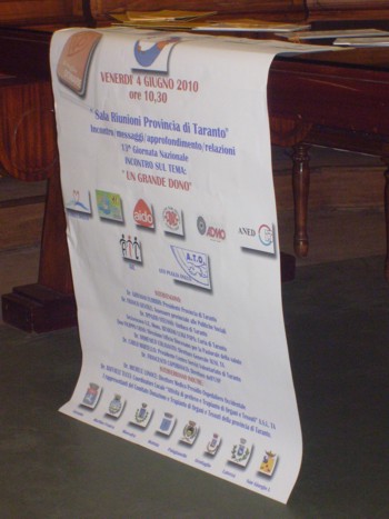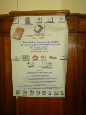 della 13ª edizione delle “Giornate Nazionali sulla donazione e trapianto d’organi”. Il Comitato provinciale, nato per diffondere la ”cultura della donazione”, come sottolinea il vice presidente regionale Antonio Motolese, “si è impegnato nella realizzazione di 18 iniziative in tutta la Provincia, grazie al contributo della Provincia di Taranto, dell’Assessorato alle Politiche Sociali e del Centro Servizi del Volontariato di Taranto”.