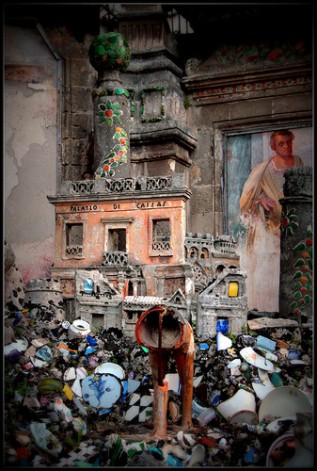 Decise, infatti, di bussare ad ogni casa, ad ogni bottega, ad ogni portone per reperire vecchie stoviglie, cocci di ceramica, maiolica, vetri e specchi, tegole e qualunque altro tipo di materiale colorato; una volta adoperatolo tutto quanto, andò per spiagge a raccogliere le più belle conchiglie, gusci, ciottoli ed, infine, vi ci appose delle pianticelle e vi scavò due piccole vasche in cui ci inserì addirittura anguille e tartarughe d’acqua!