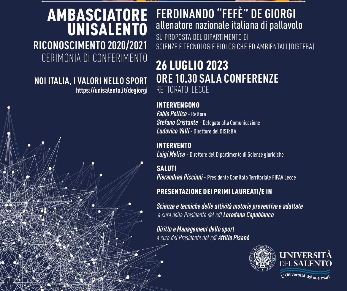 Di iniziativa del DiSTeBA - Dipartimento di Scienze e tecnologie biologiche e ambientali e attribuito con Decreto del Rettore Fabio Pollice, il riconoscimento vuole evidenziare – oltre alle riconosciute qualità di giocatore e allenatore, testimoniate dalle affermazioni mondiali ed europee in entrambi i ruoli - le doti comunicative di divulgazione e promozione delle attività culturali, sociali e sportive dimostrate da De Giorgi come commentatore per gli incontri internazionali di pallavolo e come scrittore. Il contributo di De Giorgi come Ambasciatore, inoltre, è stato e potrà essere di supporto ai corsi di studio UniSalento di area sport, sia con attività di diretta docenza e orientamento che come co-autore di libri di testo. Proprio per questa ragione, alla fine della cerimonia si festeggeranno i primi laureati e laureate UniSalento in “Scienze e tecniche delle attività motorie preventive e adattate” (Presidente del corso la professoressa Loredana Capobianco) e “Diritto e Management dello sport” (Presidente del corso il professore Attilio Pisanò). Come auspicato dal DiSTeBA, infine, la reputazione, il prestigio e i successi di Ferdinando De Giorgi a livello mondiale potranno costituire “uno strumento di supporto allo sforzo e all’impegno in atto in UniSalento per l’internazionalizzazione presso istituzioni, enti e organizzazioni estere”.