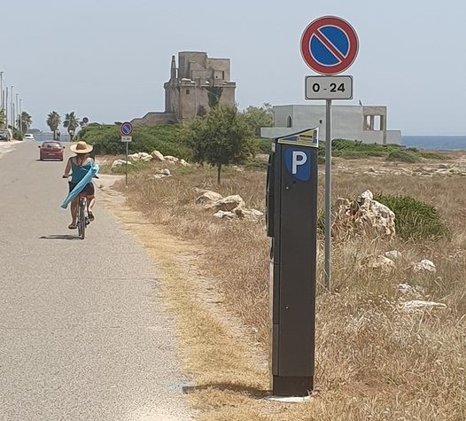 Un parcometro ad un paio di metri da un segnale di divieto di sosta a poche decine di metri da Torre Colimena.