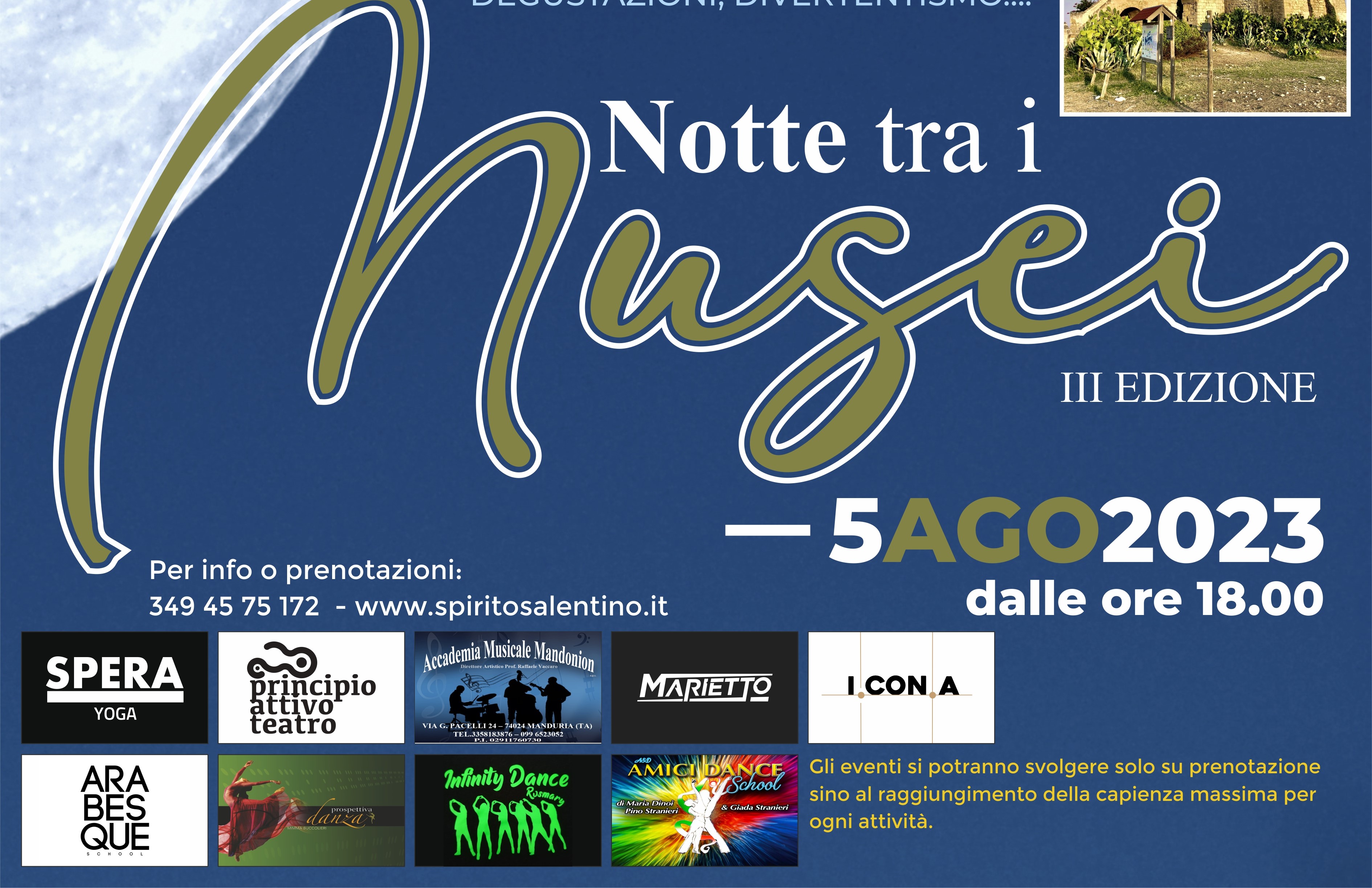 La Notte tra i Musei è organizzata dalla Cooperativa Spirito Salentino, patrocinata dal Comune di Manduria, da ICOM - International Council of Museums, da Sistema Impresa, Confcommercio Taranto e Gal Terre del Primitivo.