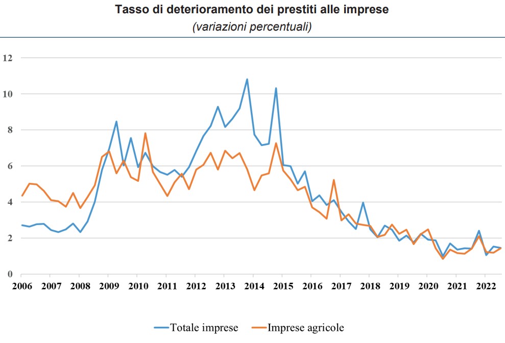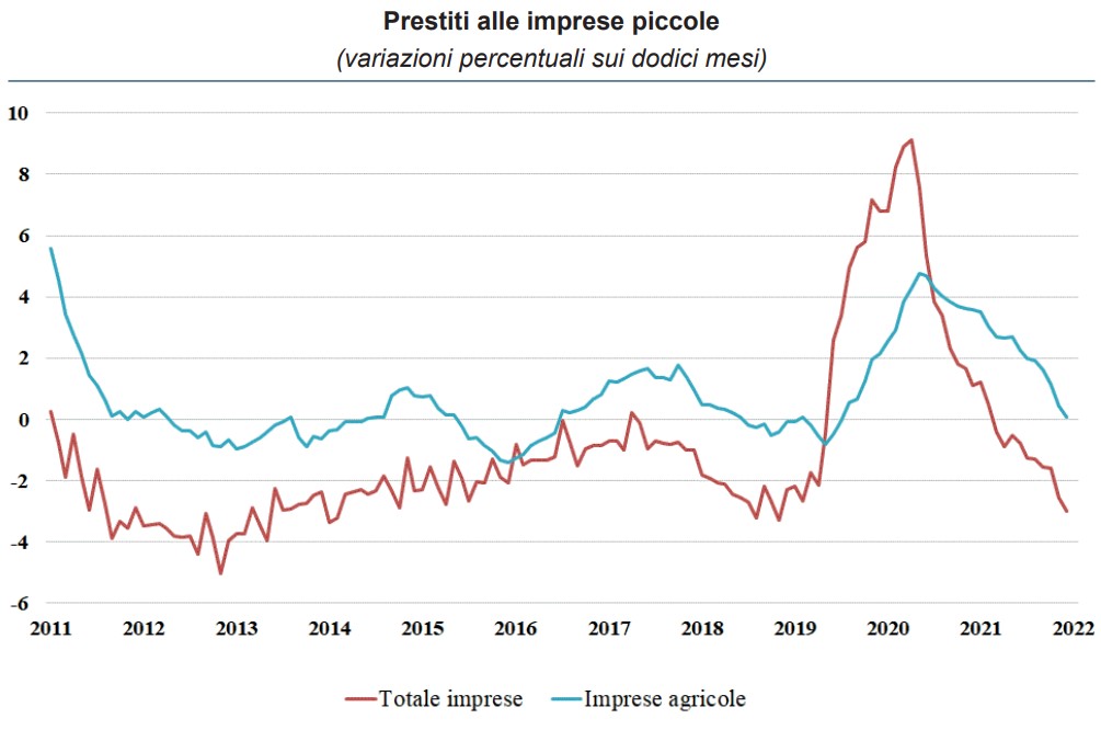 2022-2023, IL BIENNIO NERO. Al rincaro dei prezzi delle materie prime energetiche e dei fertilizzanti si sono sommati eventi climatici avversi, prima tra tutti una grave siccità nel 2022. Eventi che in molti casi hanno compromesso i raccolti. Secondo stime preliminari, nel 2022 la produzione agricola sarebbe diminuita dello 0,7 per cento in volume, il valore aggiunto dell’1 per cento (Istat). Negli ultimi mesi, i prestiti alle piccole imprese hanno bruscamente decelerato, a seguito sia di un indebolimento della domanda sia di un inasprimento delle condizioni di offerta.