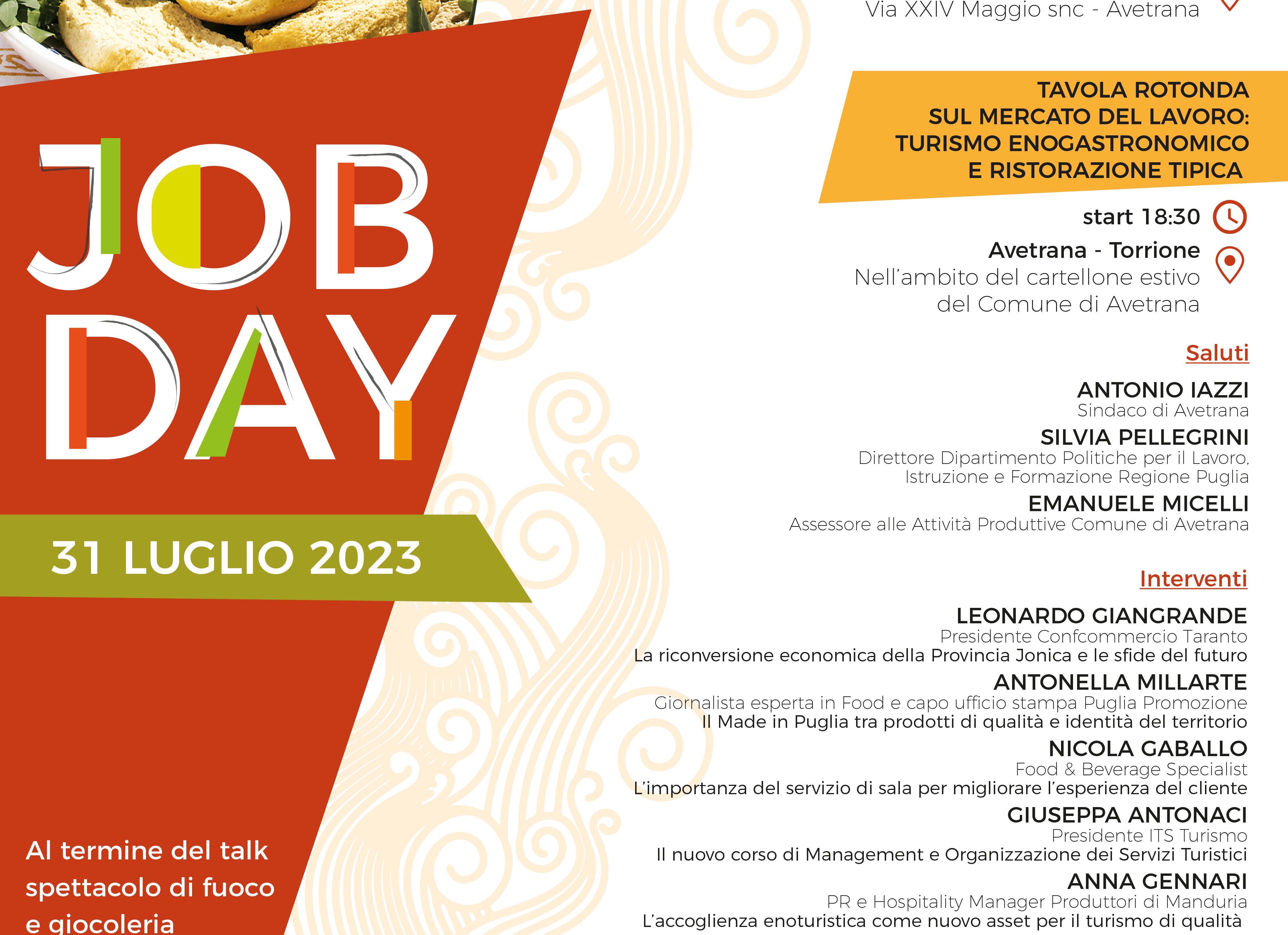 Job Day Estate (la programmazione estiva - a cura di Sistema Impresa/Confcommercio - di incontri incentrati sul tema del ‘lavoro’ nell’ambito dell’avviso regionale Punti Cardinali), lunedì 31 luglio, sarà ad Avetrana con un talk su “Mercato del Lavoro: turismo enogastronomico e ristorazione tipica”. Spazio ad un tema di attualità nell’ambito della programmazione del cartellone estivo di appuntamenti dell’Amministrazione comunale, con un incontro dedicato all’avvertito tema del lavoro e della difficoltà di reperimento di personale nella filiera turistica, ed in particolare nell’ambito della ristorazione, dove accanto alle professioni qualificate vengono richieste oggi figure ad alta specializzazione.
