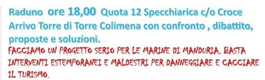 Comitato pro Torre Colimena e Specchiarica, Spiaggia per Tutti Torre Colimena e Noi per la Difesa del Territorio, con la partecipazione e il sostegno dei Comuni di Avetrana, Erchie e Torre Santa Susanna, hanno organizzato, per martedì 8 agosto, un corteo, che prevede il raduno alle 18 a Quota 12, in località Specchiarica.