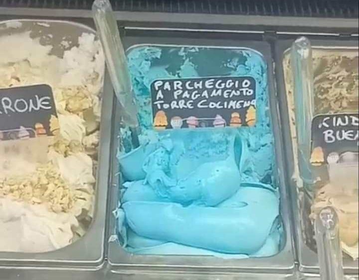Ebbene, una gelateria ha pensato simpaticamente di creare e lanciare un nuovo gusto: l’ha battezzato “Parcheggio a pagamento Torre Colimena”. Il colore? Chiaramente blu…