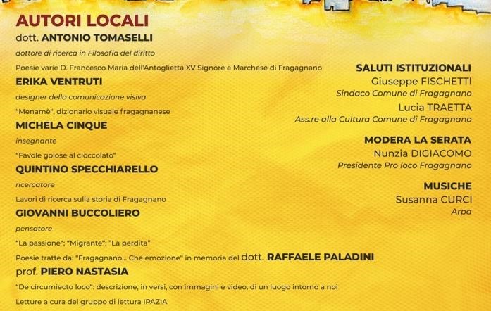 Nel corso della serata verranno declamate, a cura del gruppo di lettura Ipazia, poesie tratte da: “Fragagnano... una emozione”, in memoria di Raffaele Paladini, già sindaco di Fragagnano e figura importante per la storia del paese.