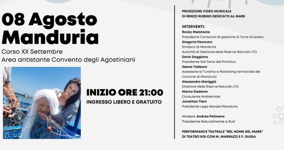 La serata inizierà con la proiezione di un video dedicato al mare, di Renzo Rubino. A seguire una talk per parlare di tutela del mare e valorizzazione della pesca sostenibile e della piccola pesca artigianale.