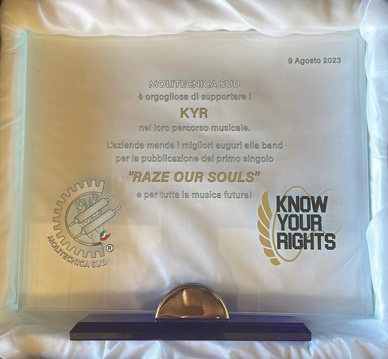 “Sono davvero orgoglioso del percorso musicale dei KYR” il commento di Carlo Pellicola. “Ci conosciamo da tanto tempo ormai e li ho visti crescere. Insieme abbiamo organizzato tante iniziative di musica e beneficenza e io sono grato per questo. Insieme a Molitecnica Sud, non potevo che supportare la band nel loro progetto e in particolare nell’evento di presentazione dell’inedito “Raze Our Souls“. Poi è sempre un piacere vederli esibire dal vivo, trasmettono tanta energia. Infine, rinnovo gli auguri espressi nella targa che ho consegnato al gruppo. Al prossimo evento!”