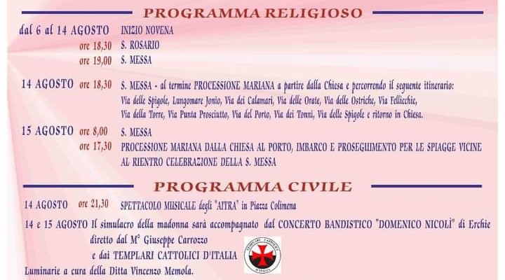 LUNEDI’ 14 AGOSTO – Ore 18,30: Messa. Al termine processione Mariana a partire dalla chiesa e percorrendo il seguente itinerario: via delle Spigole, lungomare Ionio, via dei Calamari, via delle Orate, via delle Ostriche via Fellicchie, via della Torre, via Punta Prosciutto, via del Porto, via dei Tonni, via delle Spigole e ritorno in chiesa.