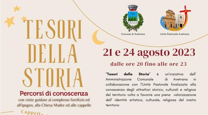 E’ stata denominata “Tesori della storia”. E’ un’iniziativa dell’Amministrazione comunale, che, in collaborazione con l’Unità Pastorale, propone, ad avetranesi e turisti, dei percorsi di conoscenza con visite guidate al complesso fortilizio ed all’ipogeo, alla chiesa Madre e alle cappelle.
