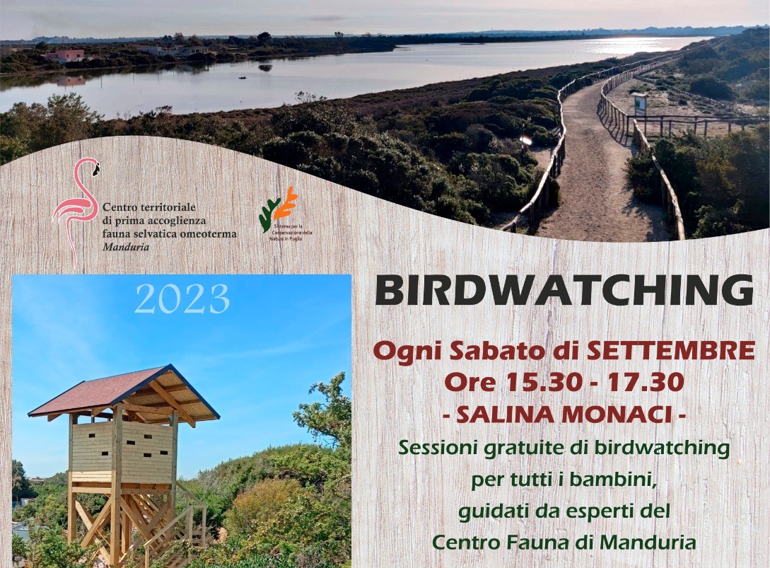 «Visto le numerose richieste pervenute, e il tempo clemente, abbiamo deciso di aggiungere ulteriori attività di birdwatching ogni sabato pomeriggio presso la torretta della Salina Monaci» scrive sui social Alessandro Mariggiò, direttore delle Riserve Naturali.