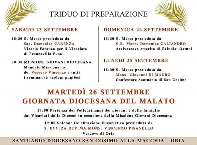 DOMENICA 24 SETTEMBRE – Ore 18,30: S. Messa presieduta da mons. Domenico Caliandro, arcivescovo emerito di Brindisi e Ostuni.