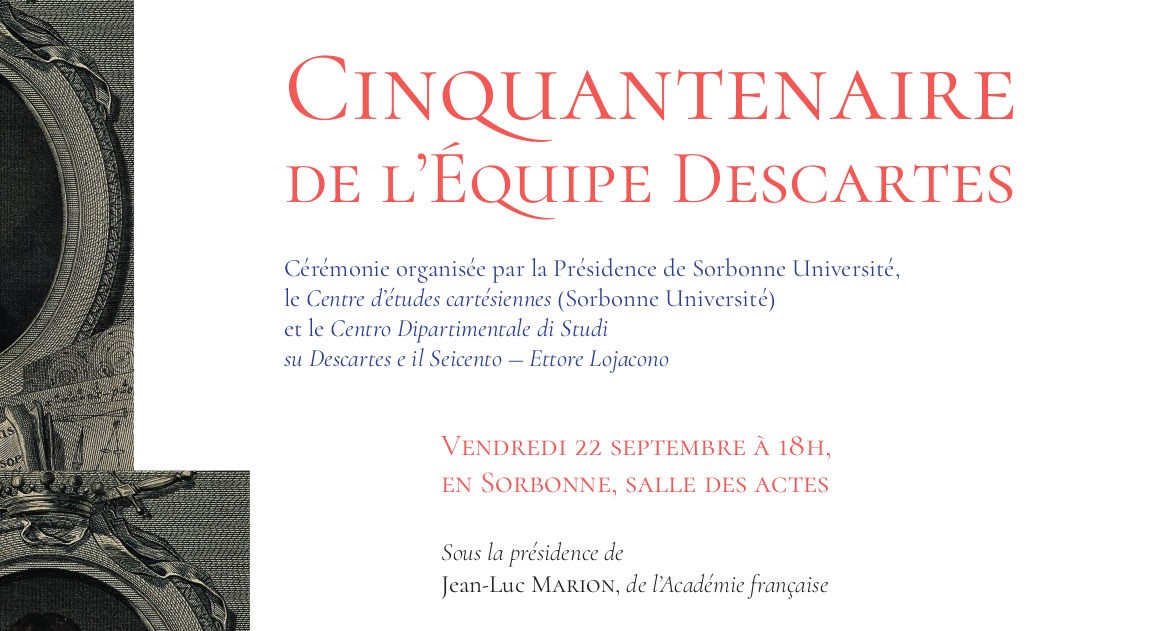 È in programma venerdì 22 settembre a Parigi, presso la Sorbonne Université, un incontro bilaterale di collaborazione scientifica tra la stessa Sorbonne Université e l’Università del Salento. Moderato dal professor Jean-Luc Marion de l’Académie française, con la partecipazione dei professori Jean-Robert Armogathe e Giulia Belgioioso. L’incontro si svolgerà dalle ore 18 nella “Salle des actes” e sarà dedicato alla celebrazione dell’Équipe Descartes e dei 51 anni del “Bulletin cartésien”, il principale strumento bibliografico degli studi cartesiani, pubblicato in partnership dal Centre d’études cartésiennes parigino e dal Centro Dipartimentale di Studi su Descartes - ‘Ettore Lojacono’ dell’Università del Salento su www.cartesius.net.