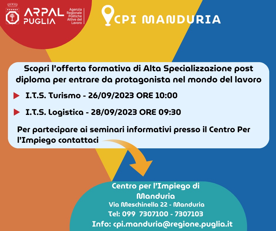 Il Centro per l’Impiego di Manduria, in collaborazione con il Sistema degli I.T.S. Academy - Puglia, organizza due incontri informativi rivolti a chi è in possesso del diploma di scuola secondaria di secondo grado (liceale, tecnico o professionale).