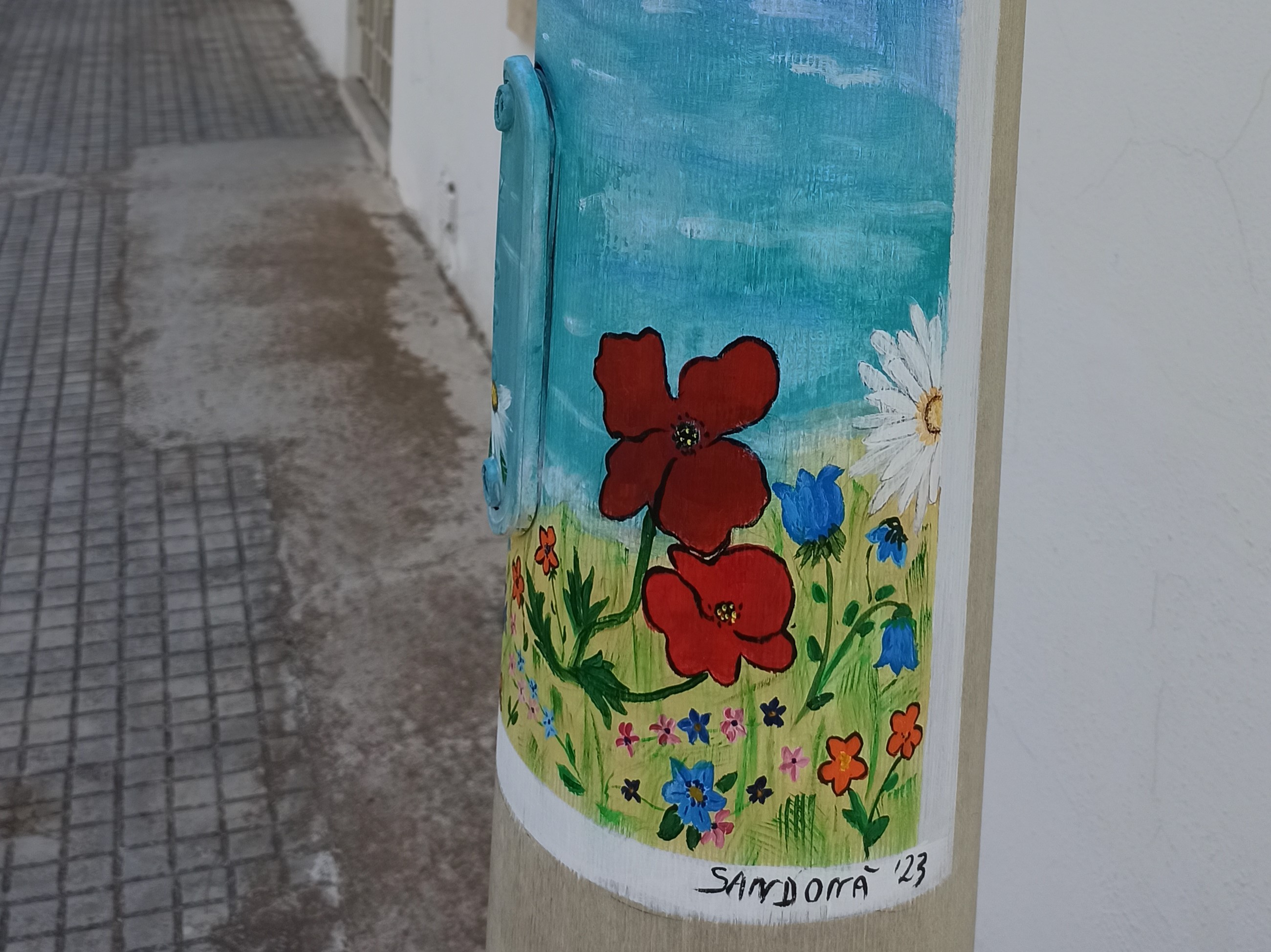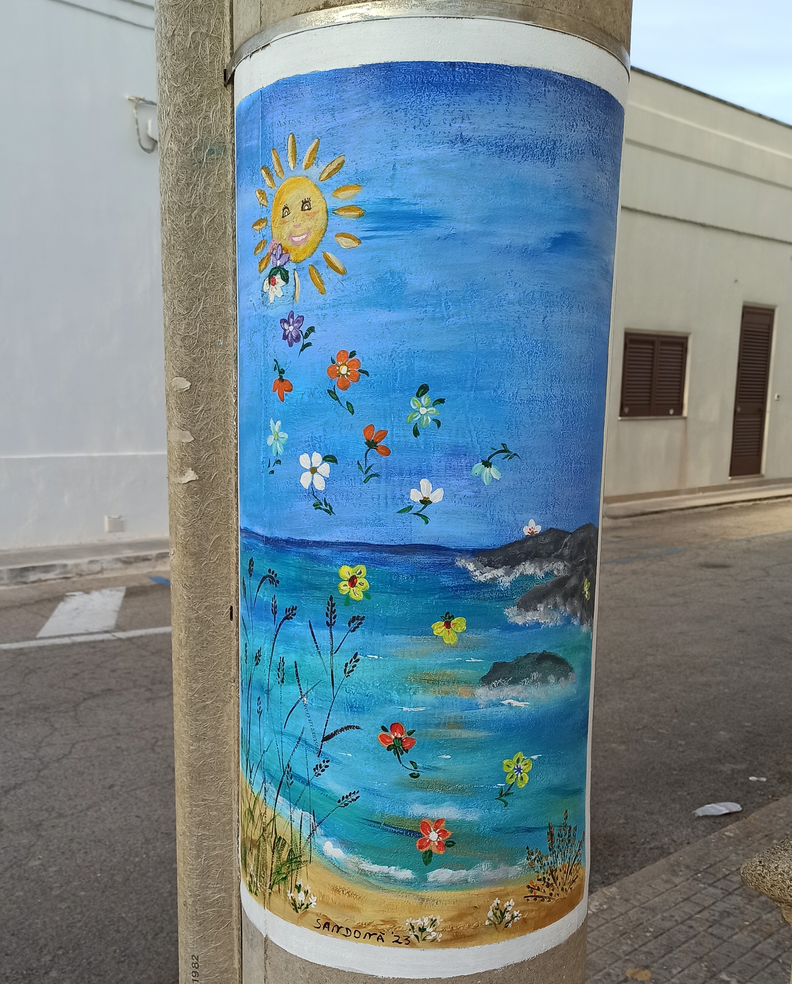Prima della scorsa estate, Maristella Sandonà ha donato la propria arte ai villeggianti di Torre Colimena. Ha decorato ed abbellito diversi pali della pubblica illuminazione, cabine dell’ente elettrico e altri luoghi con i suoi incantevoli disegni.