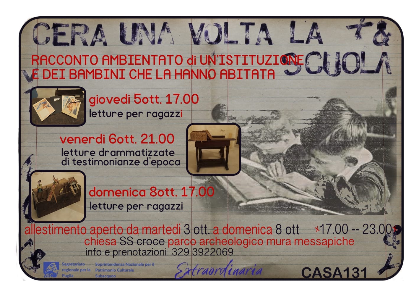 Nell’ambito delle attività del progetto Extraordinaria del Segretariato regionale del MiC per la Puglia, nel cantiere del Parco archeologico delle Mura messapiche di Manduria (ex chiesetta di Santa Croce), in via Sant’Antonio a Manduria, è visitabile, sino a domenica 8 ottobre, la mostra “C’era una volta la scuola”.