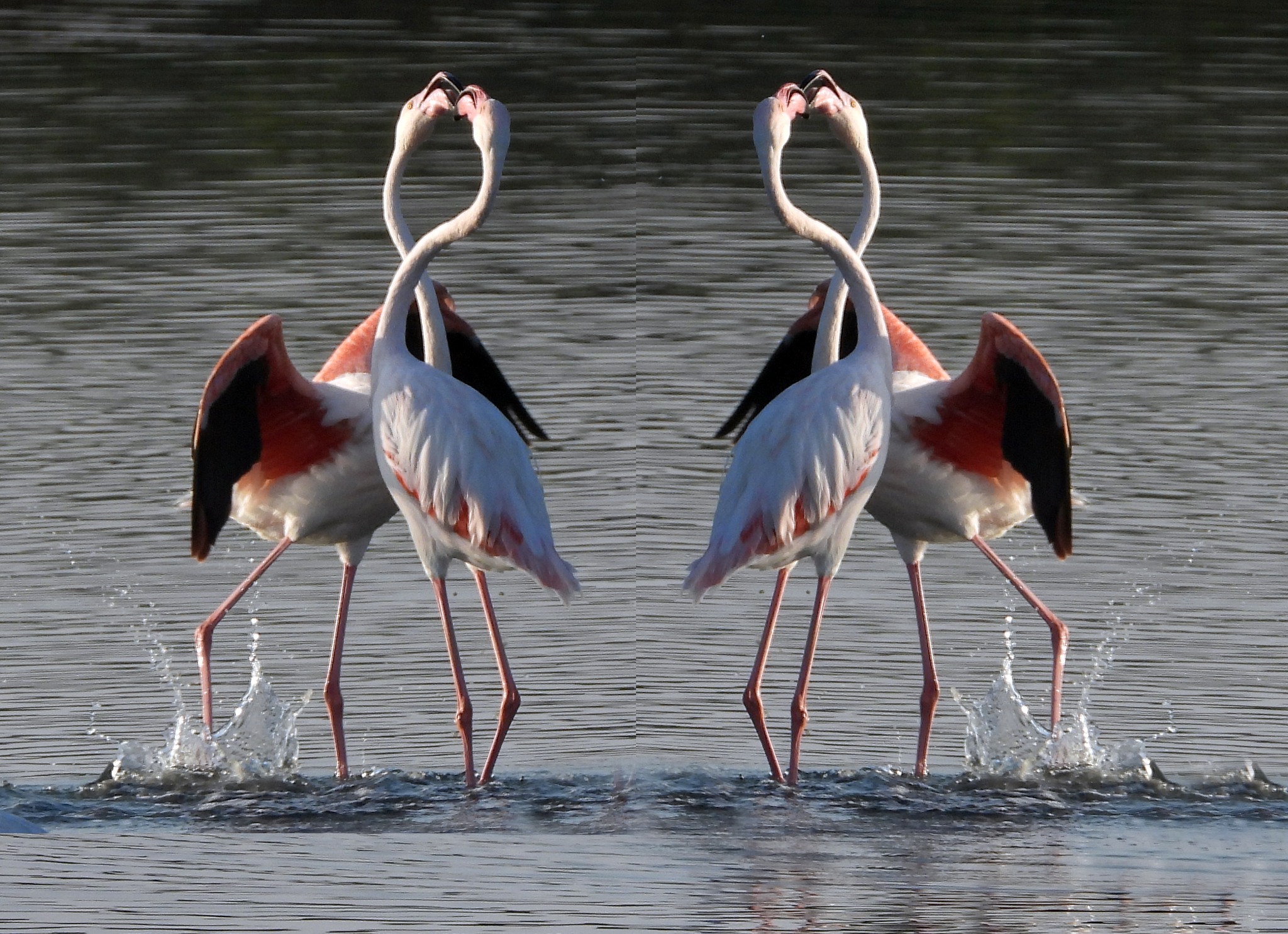 Bellezza, eleganza e amore nella bellissima foto di Carlo Bizzini: i corteggiamenti fra due coppie di fenicotteri.