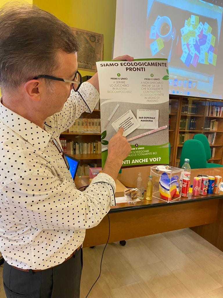 Giovanni Sanasi, il gestore del bar dell’ospedale “Marianna Giannuzzi”, è stato ospite dell’istituto Einaudi di Manduria: ha presentato agli studenti i suoi brevetti (Refrebox, Unica, Acca 2.0, Ecco qua, La metà).