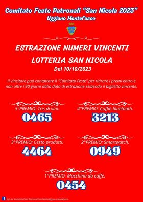 I vincitori potranno contattare il Comitato Feste per ritirare i premi entro e non oltre i 90 giorni dalla data di estrazione, esibendo il biglietto vincente.