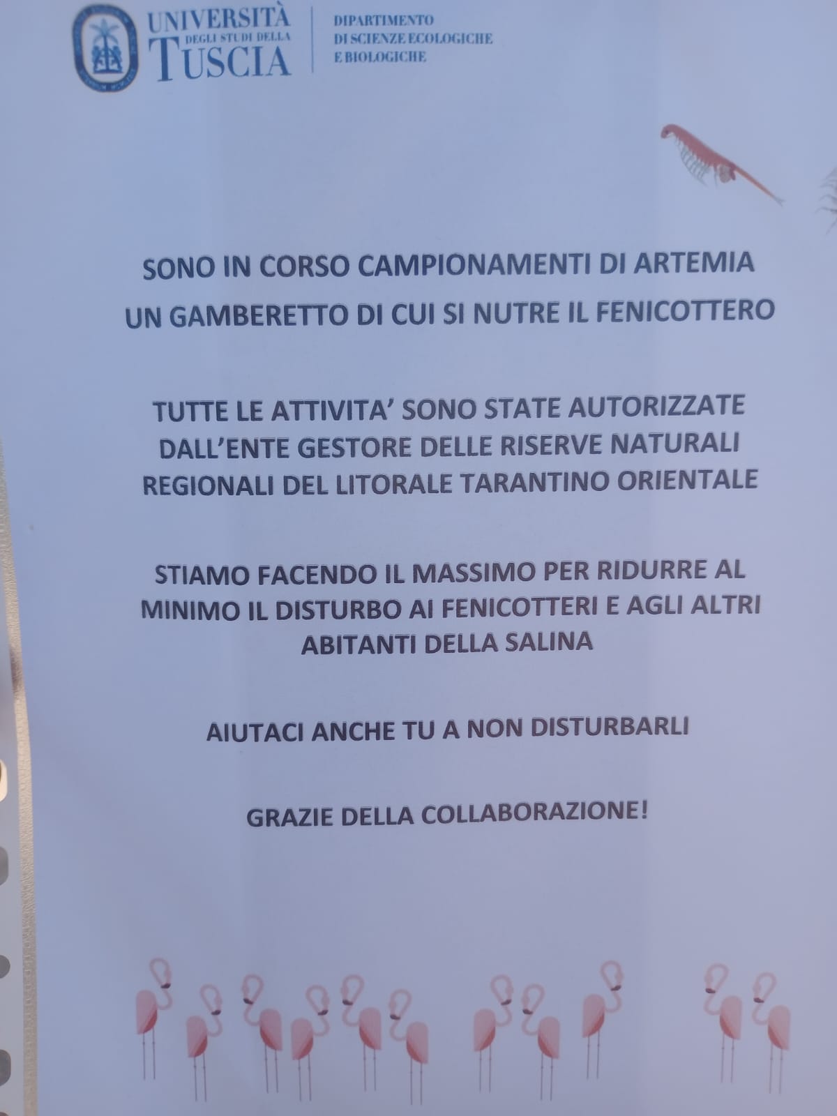 Presso la Salina Monaci sono stati effettuati nei giorni scorsi i campionamenti di Artemia spp. nell’ambito di un complesso progetto di ricerca dell’Università della Tuscia denominato “Pahrasite in polluted waters: assessing the effects oh pahs on host-parasite interactions”.