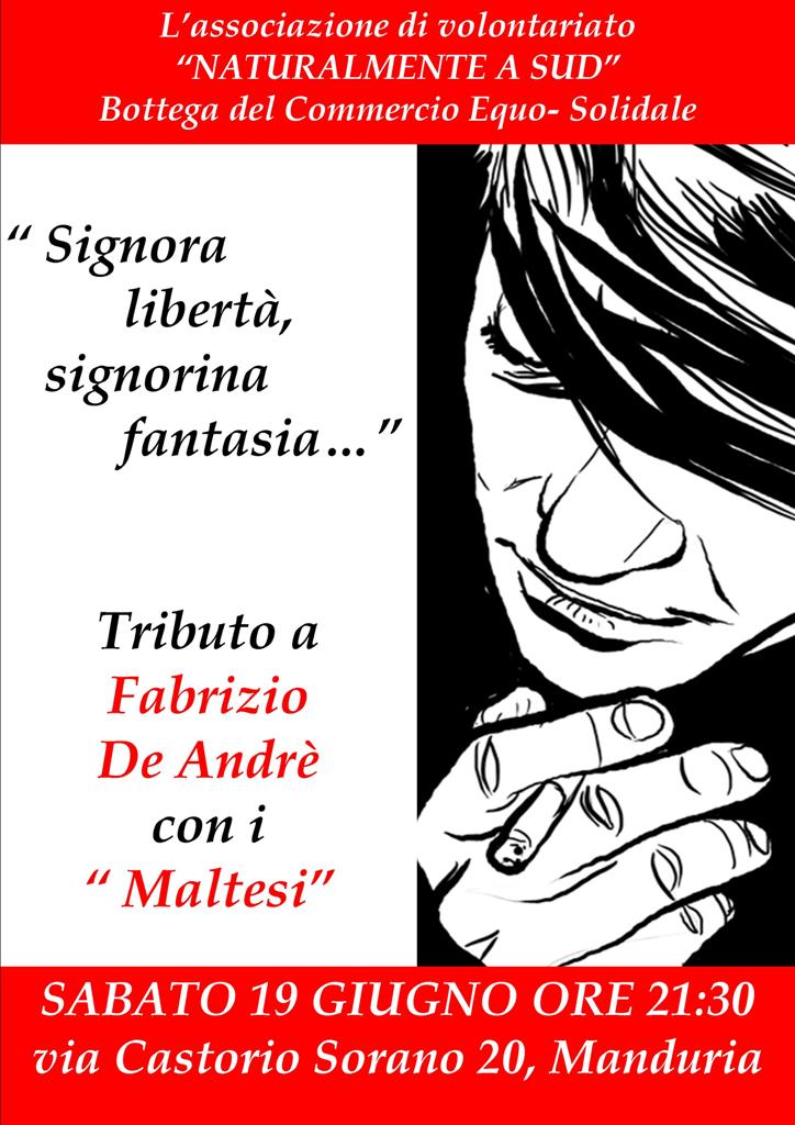 volontariato “Naturalmente a Sud” di Manduria presenta, presso la propria sede, un tributo a Fabrizio De Andrè, uno deipiù grandi cantautori della storia della musica italiana, a cura dei “Maltesi”.
